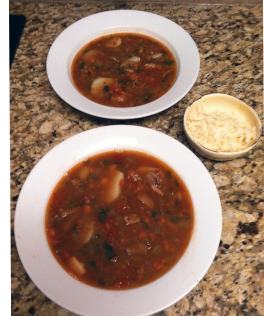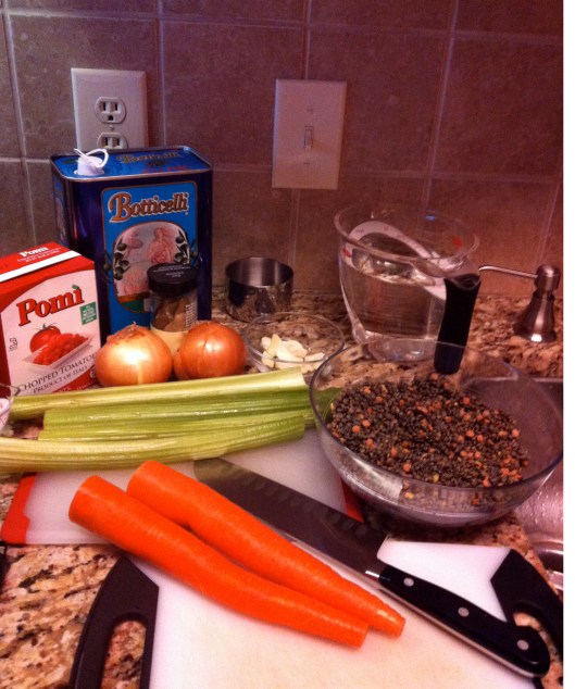 **I used all the green lentils that I had on hand, and supplemented with brown in order to get to 2 cups—remember, I was doubling this recipe. I added only 3 and 1/2 quarts of water, though, which made for a nice, thick soup.