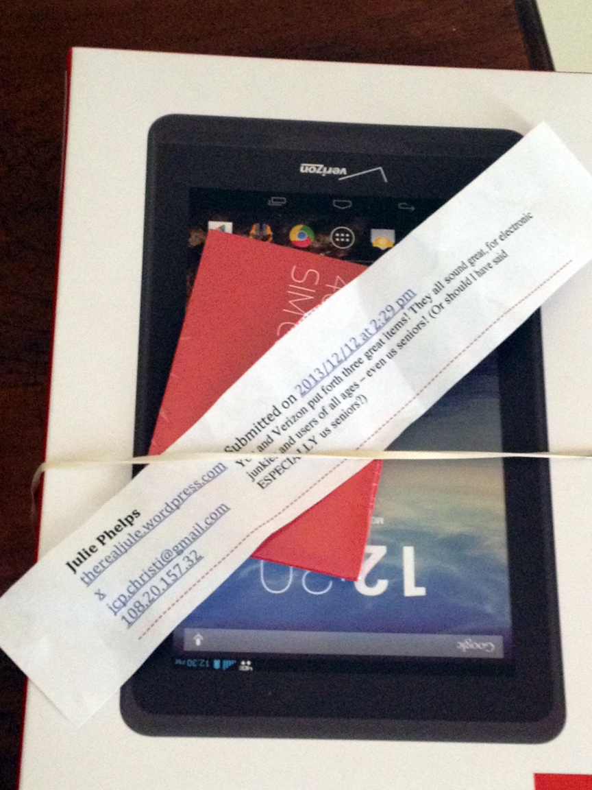 I want to thank Verizon Wireless for sending me such a fabulous mobile device, thus solving my Christmas-shopping dilemma at a time when I can barely leave the house. I also want to thank them for inviting me to be part of this incredible program. I’ve learned so much, and made many wonderful new friends. To all of them—and to you, my loyal readers—a very Happy New Year!