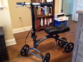 My youngest stepson is enjoying a gap year from college. He has been here every day during the week since my fall, bringing me meals on a tray, walking our dog (carefully), and performing all manner of tasks and errands until my husband returns from work in the evening. In an attempt to help further his education (maybe not much of a deal for him), I’ve taken him on as an intern for my company, teaching him a few PR ropes. He is assisting me with an important project for one of my clients, and quite frankly, I don’t know what I’d do without him. Luckily my office is on the second floor. I tool back and forth from bed to bath and beyond (well, to the office) with this nifty knee scooter.